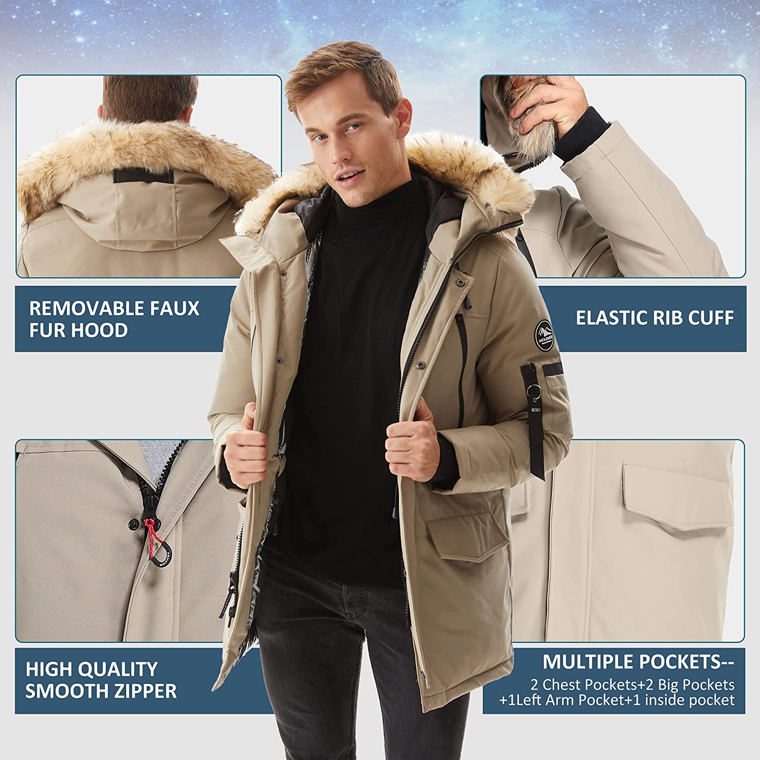 Windproof Design: 1. Adjustable velcro cuffs and stretchable glove with thumb hole help seal in warmth; 2. Detachable storm hood, stand collar, and full zipper closure, all the well-designs keep out the wind effectively; 3. Wear a resisting soft shell that is highly windproof and warm.